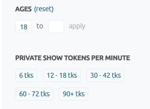 - Use the price range to filter the pages by models’ minute prices for a private show