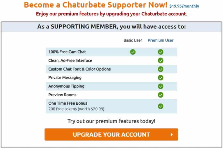 Signing up for a free or supporter membership will give you access to more features and top up your account with Chaturbate Tokens, which you can spend on private shows or use to send tips during the free cam shows.