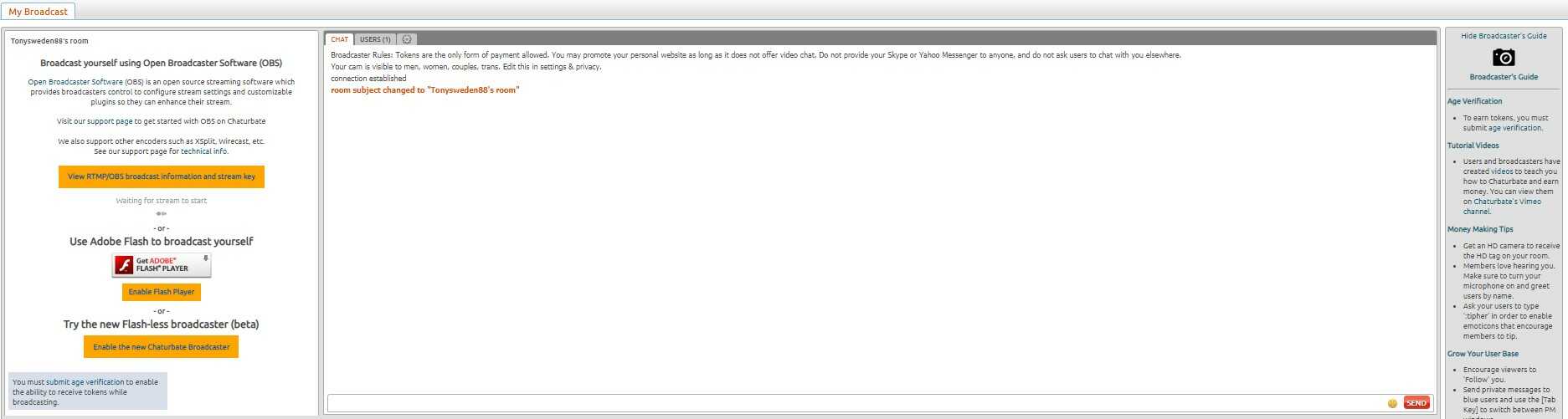 - Now, you can start broadcasting your live cam. But you need to verify your age (you need a valid ID or passport) before you can start earning money from Chaturabte. The verification link is to the right on this page.