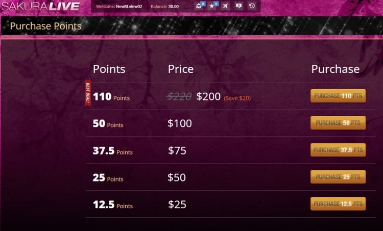 Each model can set a fixed cost per minute for her sex live shows. The site uses “points” for live shows. The average price is 2 points/minute, and the cost of each point depends on the package purchased: